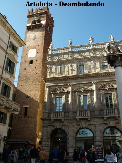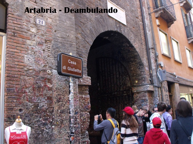 Volvimos tras nuestros pasos por la Vía Cappelo hasta llegar a la Piazza delle Erbe, con muchísimos puestos de venta ambulante y muchísima gente. Continuamos por la Piazza dei Signori (en donde se encuentra una estatua a Dante) y paramos a comer en un pequeñito bar muy cerca de la Casa de Romeo antes de ir a verla (sólo se distingue porque hay un cartel que lo indica y porque hay otro en donde hay unos versos de la famosa obra de Shakespeare).