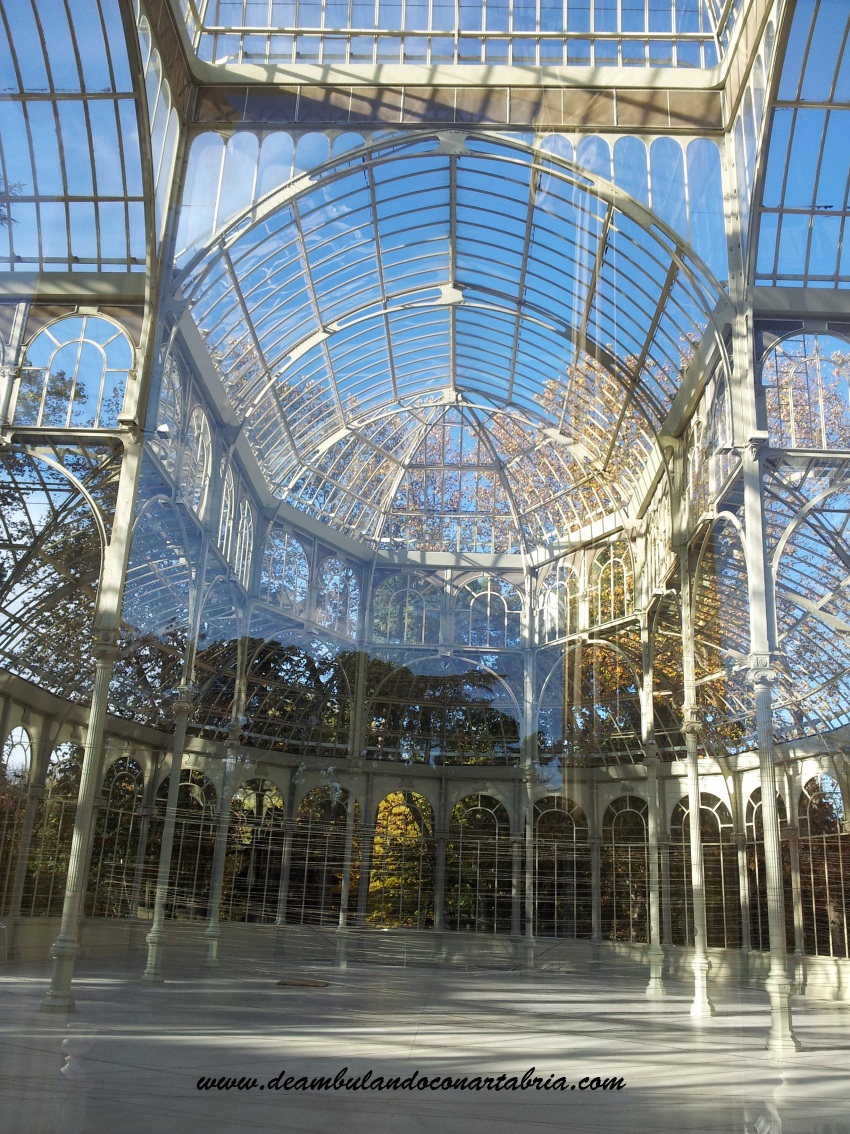 El Retiro estaba prácticamente vacío cuando llegamos, por lo que fue un paseo muy agradable. En este inmenso parque podemos ver dos palacios, el de Velázquez y el de Cristal, que fue construído en 1887. Como bien dice su nombre, sus paredes son de cristal sostenidas por columnas jónicas de hierro. Se construyó con motivo de la Exposición de las Islas Filipinas, una especie de invernadero en donde dar a conocer la diversidad de la flora existente. Desde hace años contiene exposiciones temporales, aunque cuando nosotros estuvimos, estaba totalmente vacío.