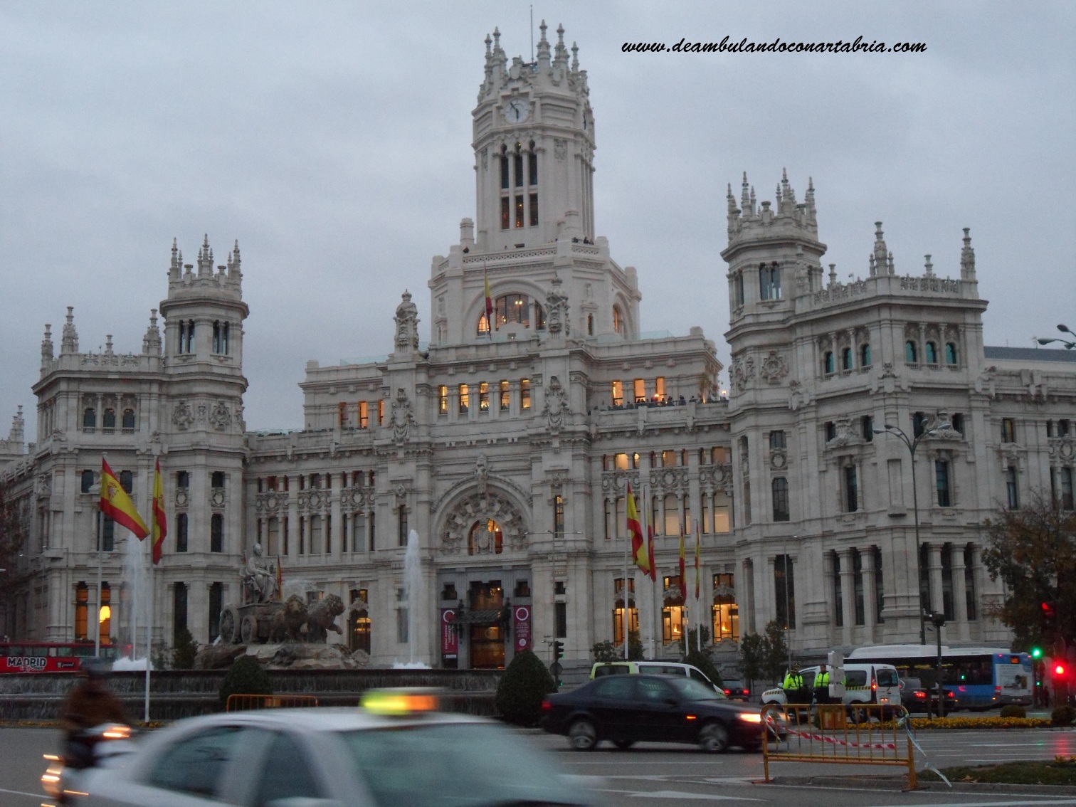 Después de comer nos dirigimos hacia la famosa Puerta del Sol, para la típica foto del Kilómetro Cero. En ella se encuentra uno de los símbolos de la ciudad, la escultura del Oso y el Madroño. Bajamos por la concurrida calle Preciados hasta el Callao y de ahí a la Gran Vía hasta la Plaza de España y el Templo de Debod (este templo está dedicado al culto de los dioses egipcios Amón e Isis y tiene una antigüedad de 2000 años). Habíamos leído que esta última visita era mejor hacerla al atardecer, pero dado que el día estaba lluvioso, decidimos adelantarla. Deshicimos nuestra ruta por la Gran Vía y nos dirigimos hacia el edificio Metrópolis (para construír este hermoso edificio, fue necesario derribar site casas. Destaca su cúpula de pizarra negra coronada por una victoria alada), el del Banco de España y la Cibeles. Allí entramos en el Palacio del mismo nombre para subir a su mirador, pero faltaba mucho tiempo para la siguiente visita, por lo que nos lo saltamos y nos acercamos a la Puerta de Alcalá. Luego enfilamos por la Carrera de San Jerónimo para ver el Congreso de los Diputados y, finalmente, cogimos el metro en Sol hacia el hotel. Estábamos cansados y habíamos andado mucho durante el día.