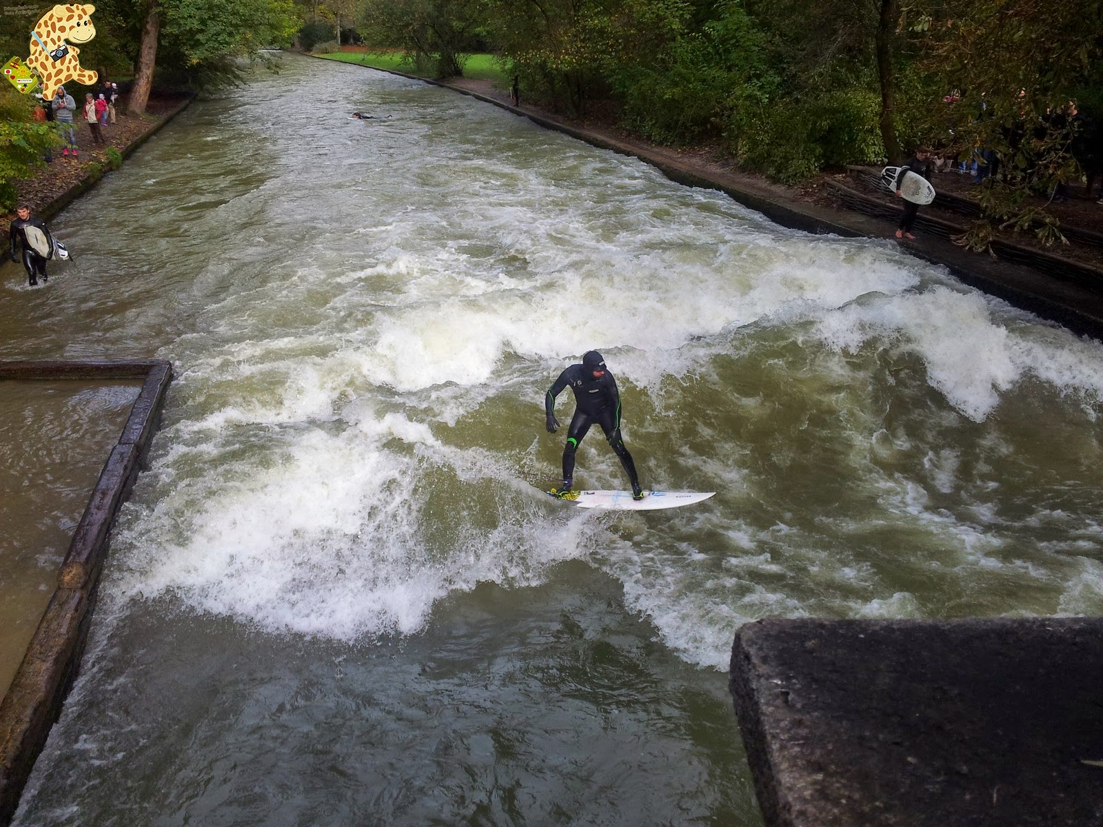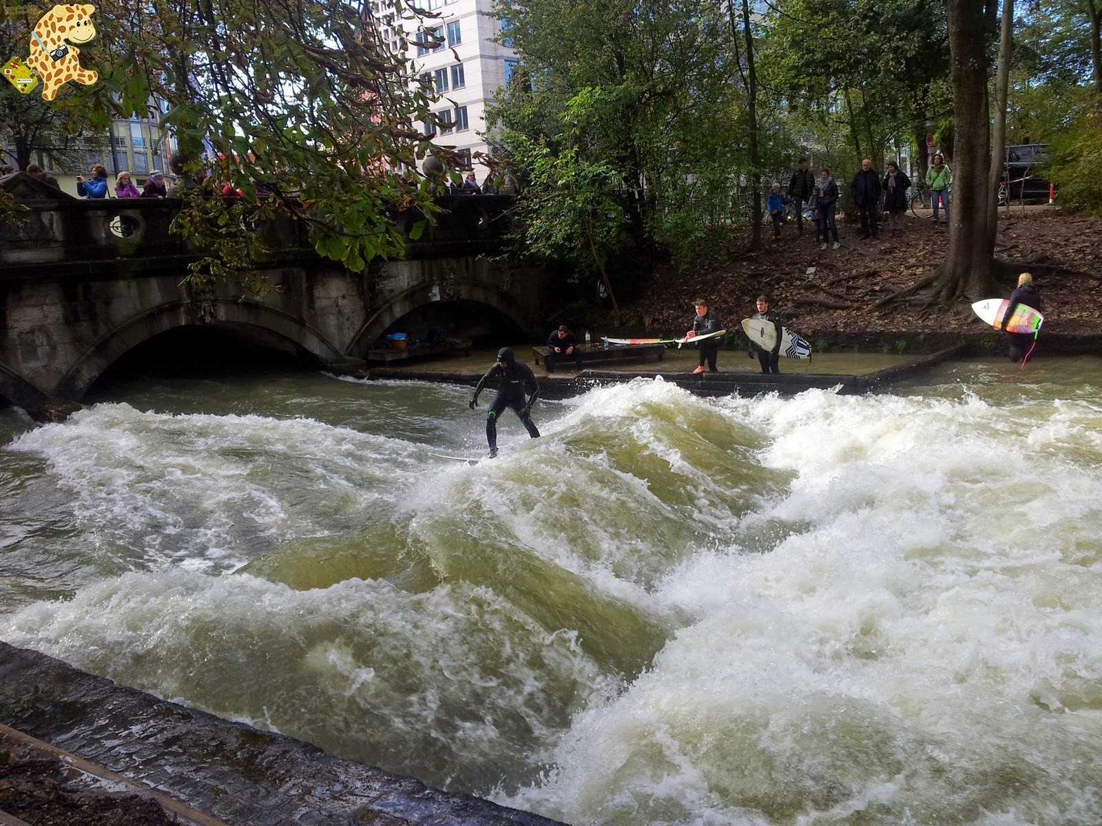 Otra de las grandes atracciones del Jardín Inglés es la ola. En el extremo sur del parque, en la Prinzregententrasse, nos encontramos con la ola artificial del Eisbach, tomada por varios surferos.