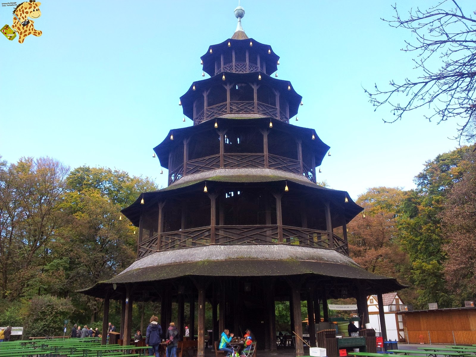 Aparte de una gran extensión de campo y senderos, podemos encontrarnos un pequeño templo griego, el Monopteros, una casa de té (Japanisches Teehaus) y una torre china (Chinesicher Turm). Al lado de esta última edificación, se encuentra la cervecería al aire libre más antigua de Munich.