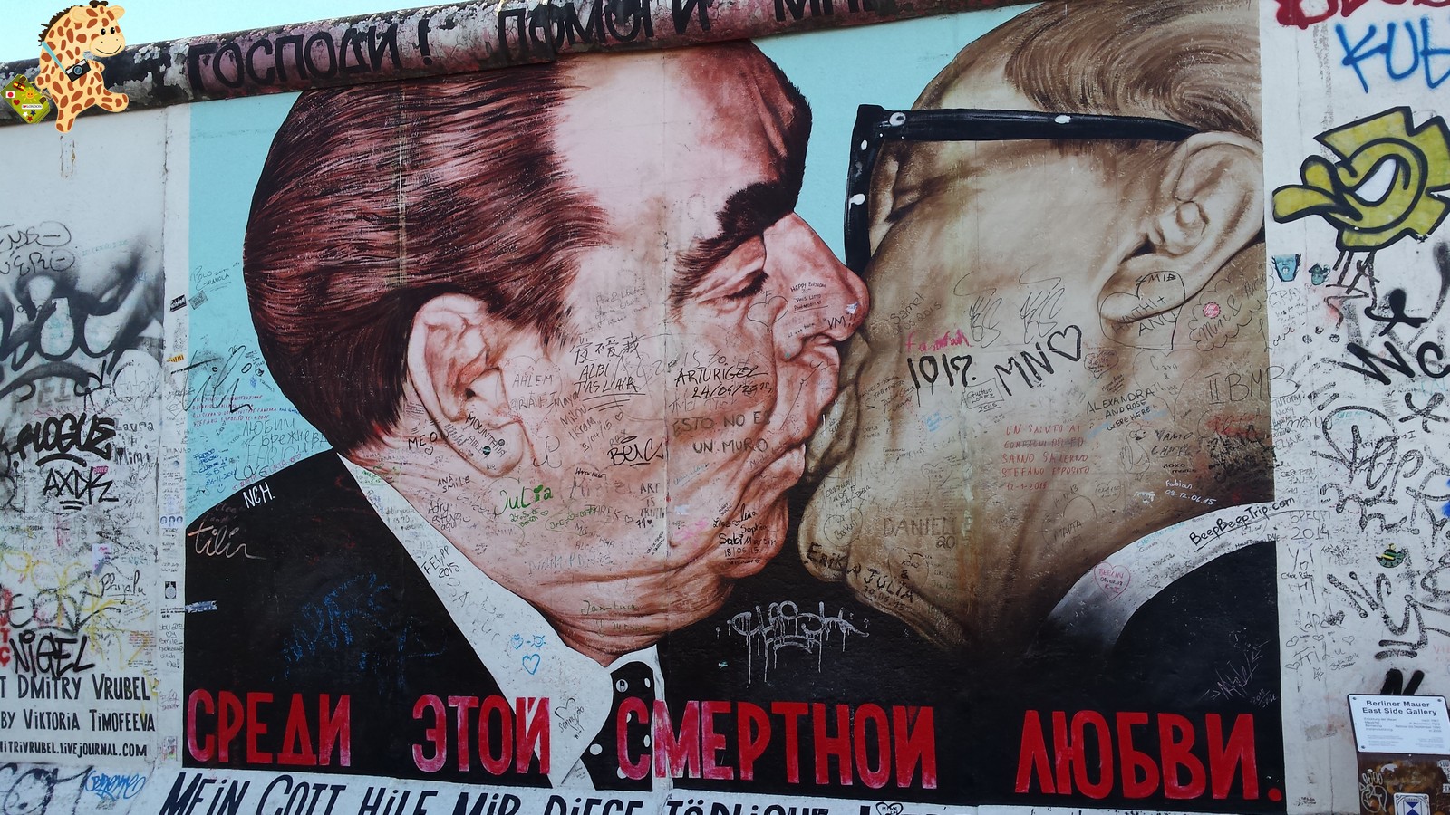 La East Side Gallery es el tramo más largo del muro que ha sobrevivido. Es 1,3 km convertido en un enorme lienzo lleno de graffitis. El más conocido es el Beso entre Breznev y Honecker de 1990. Nosotros llegamos a la East Side Gallery cruzando el Oberbaumbrücke, un puente de ladrillo con murallas almenadas y dos torres construido en 1896.