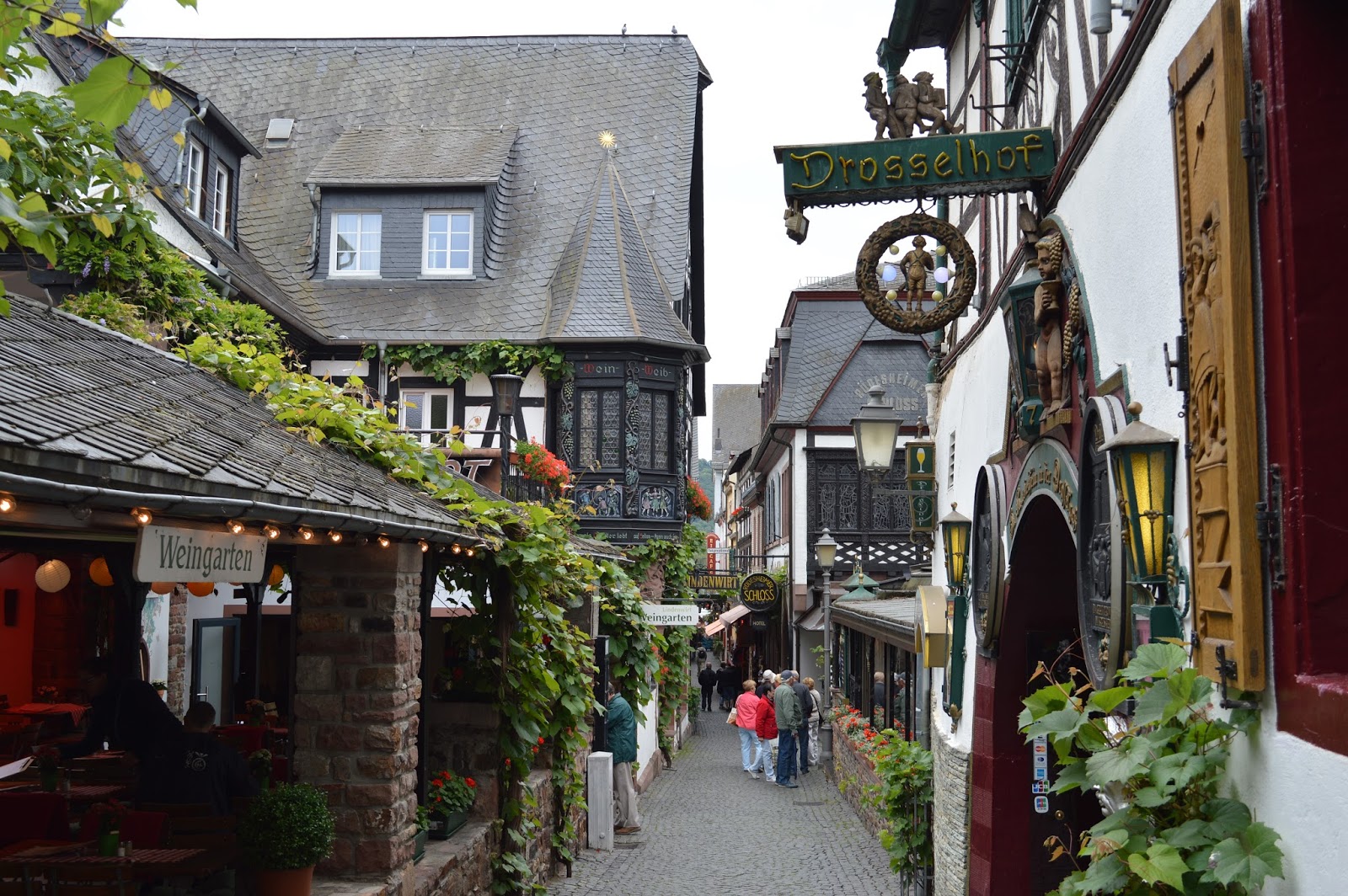Es un pueblo precioso en donde destaca una callejuela llamada Drosselgasse, que ya fue citada en el s. XV. Hoy en día es famosa por sus tabernas y tiendas. Y si es que en algo destaca el Rhin, además de por sus bellos pueblos, es porque en su valle hay numerosos viticultores que producen vinos de renombre.